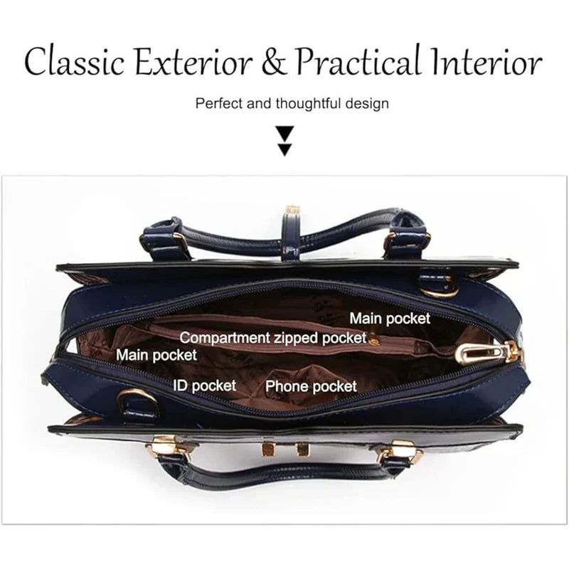 The Croco Glam Handbag fuses eye-catching crocodile-embossed leather with polished gold-tone hardware for a look that’s as refined as it is functional. Its roomy interior keeps your essentials neatly organized, and the included matching mini wallet ensures you’re always ready on the go. Whether you carry it by the top handle or sling it crossbody, this statement bag blends sophistication with everyday practicality.