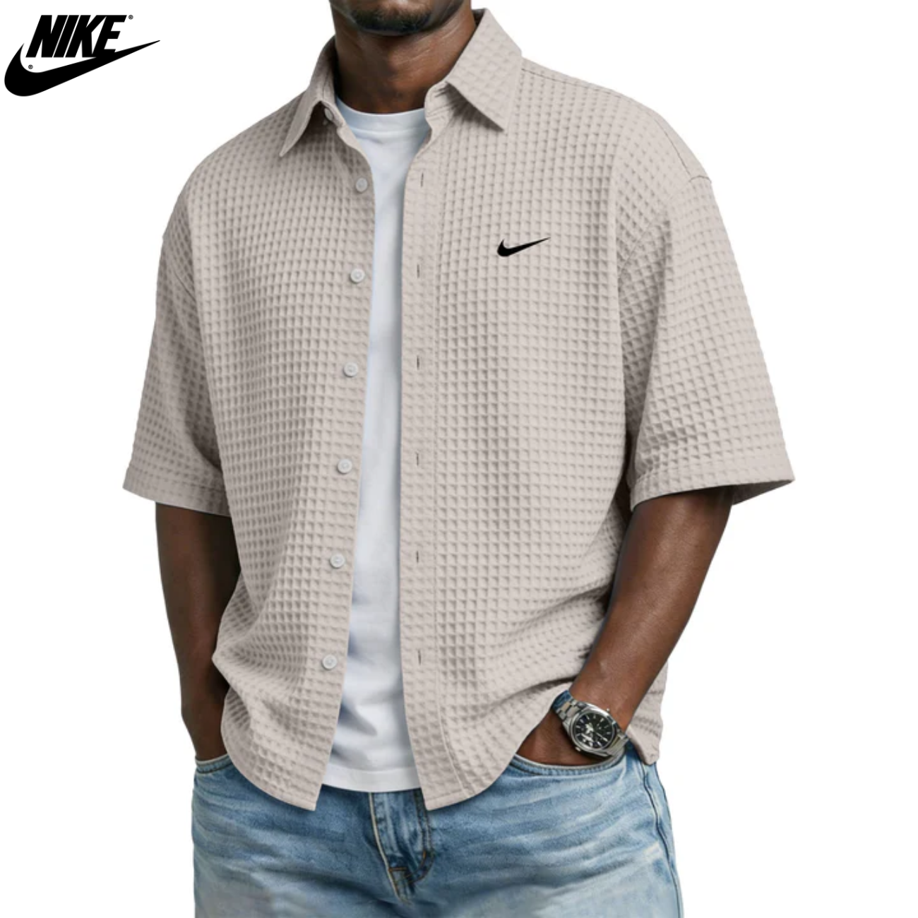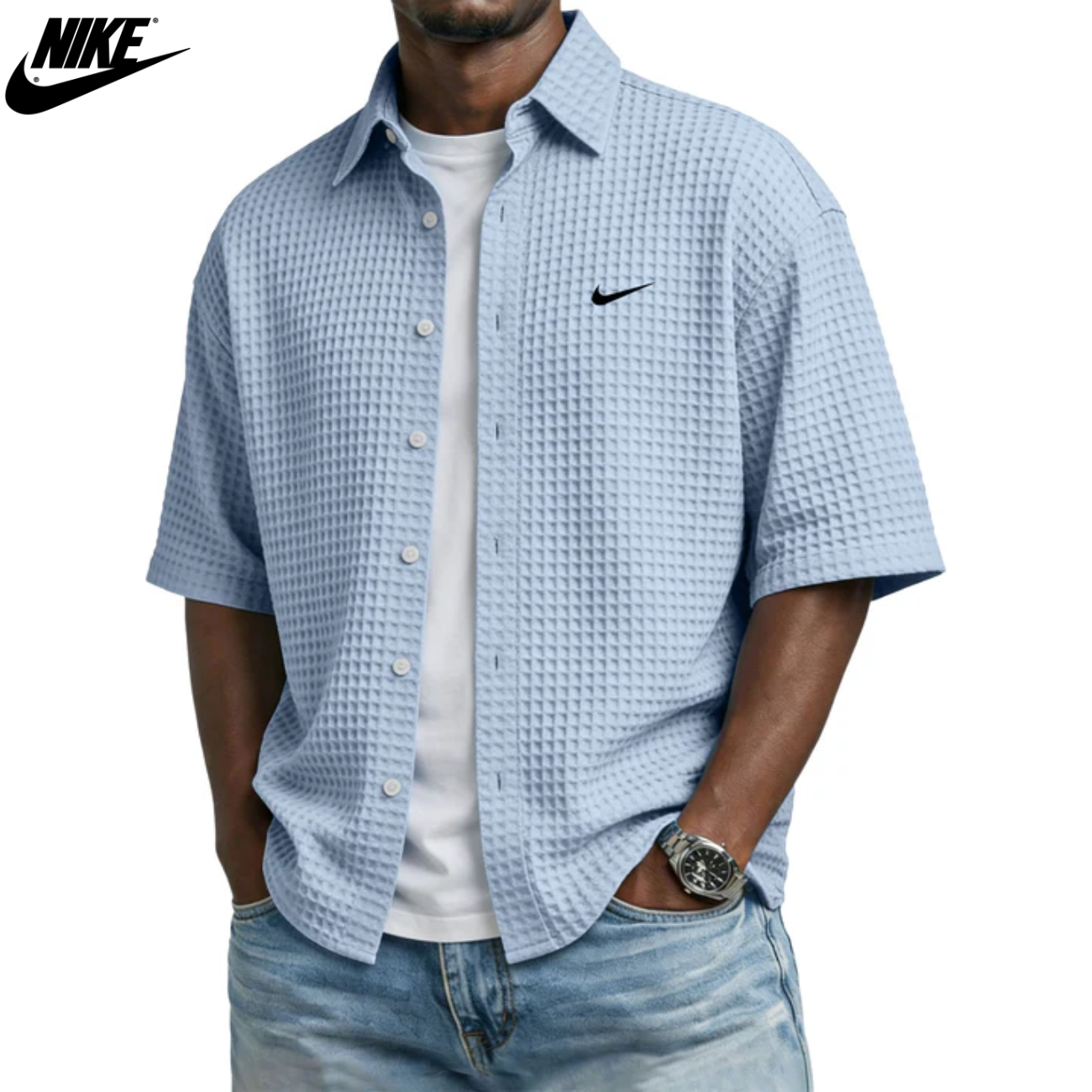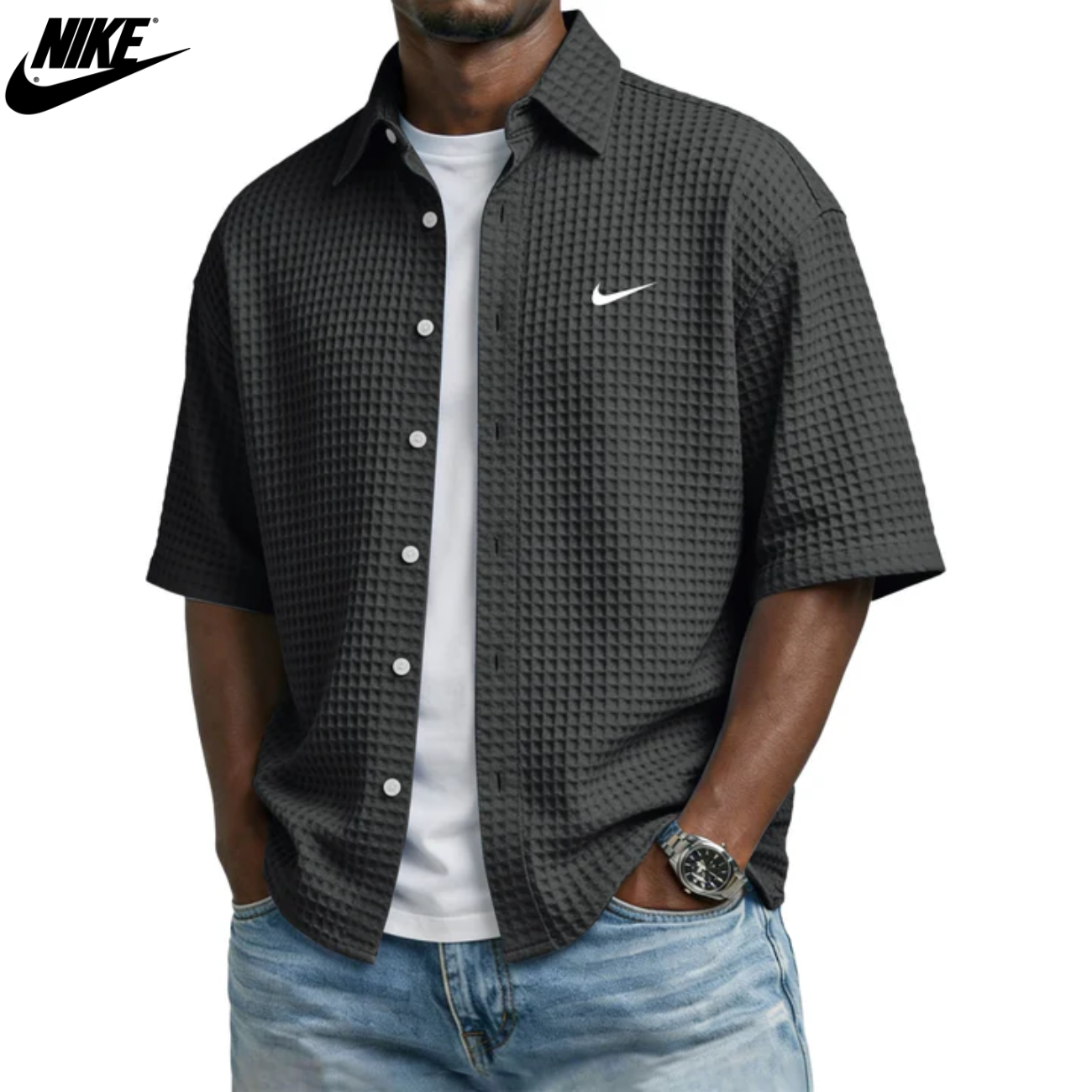 This short-sleeve button shirt stands out with its unique raised waffle-textured surface, adding depth and character to a clean, minimal design. The structured pattern not only enhances visual appeal but also helps maintain shape throughout the day, giving a polished look whether worn open or fully buttoned. Its sharp collar and tailored cut create a balanced silhouette that feels both relaxed and refined.