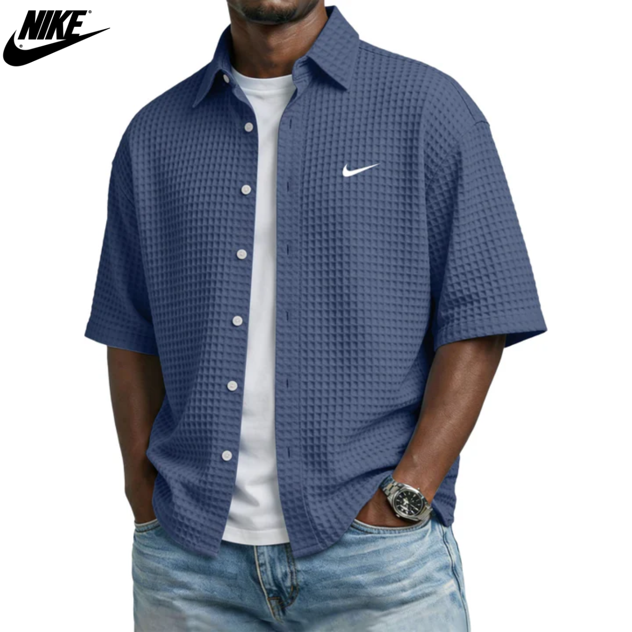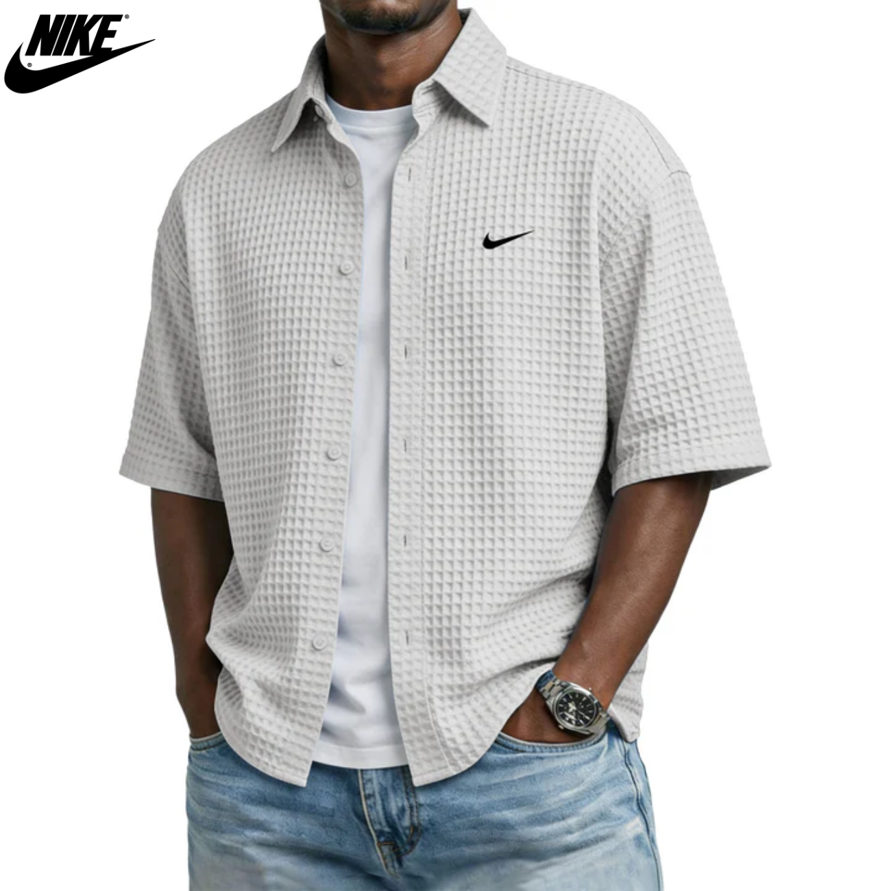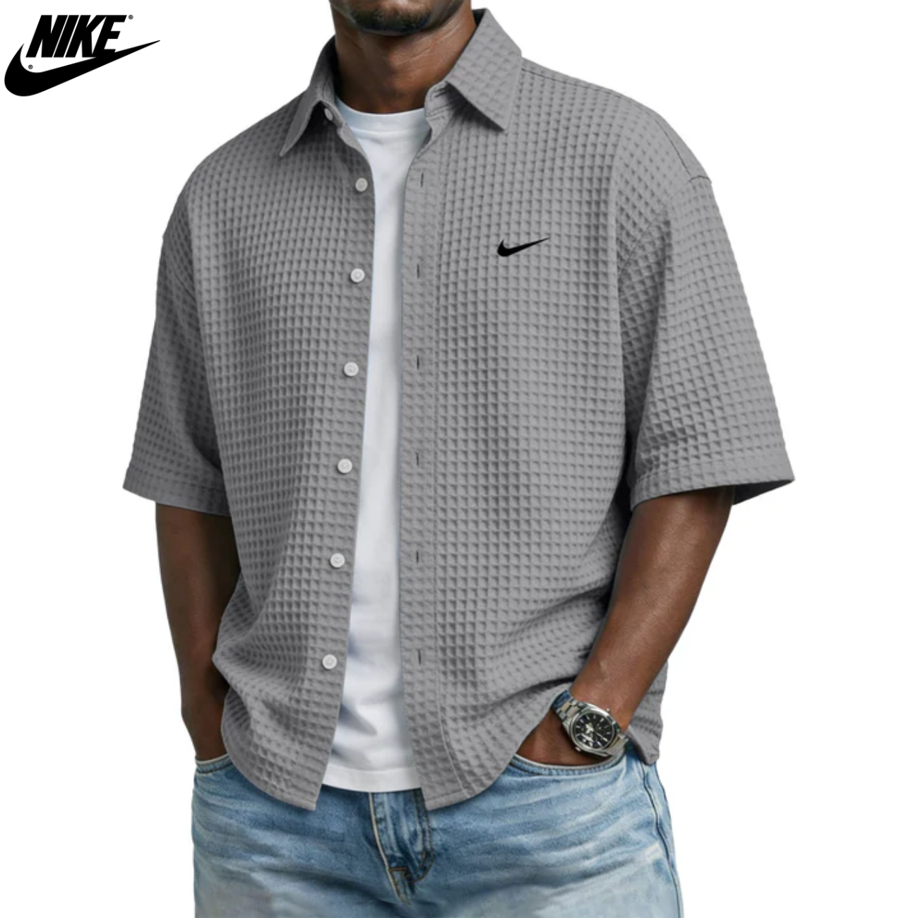 This short-sleeve button shirt stands out with its unique raised waffle-textured surface, adding depth and character to a clean, minimal design. The structured pattern not only enhances visual appeal but also helps maintain shape throughout the day, giving a polished look whether worn open or fully buttoned. Its sharp collar and tailored cut create a balanced silhouette that feels both relaxed and refined.