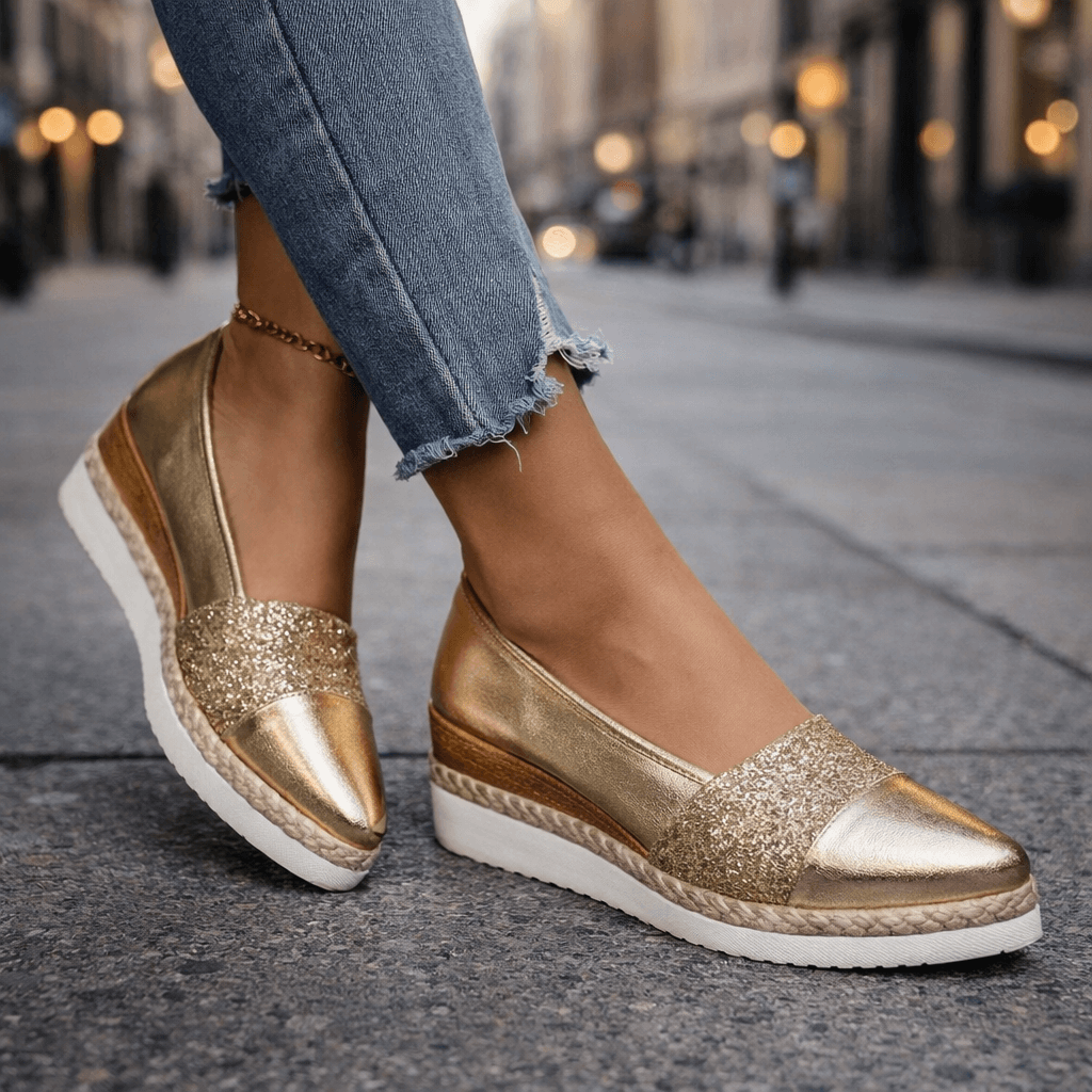 Add a touch of sparkle to your everyday look with these dazzling wedge shoes. Crafted with a shimmering finish and a glitter-accented front panel, they bring eye-catching style to any outfit. The lightweight platform sole ensures comfort, making them perfect for all-day wear—whether you're dressing up for a night out or staying chic during the day.